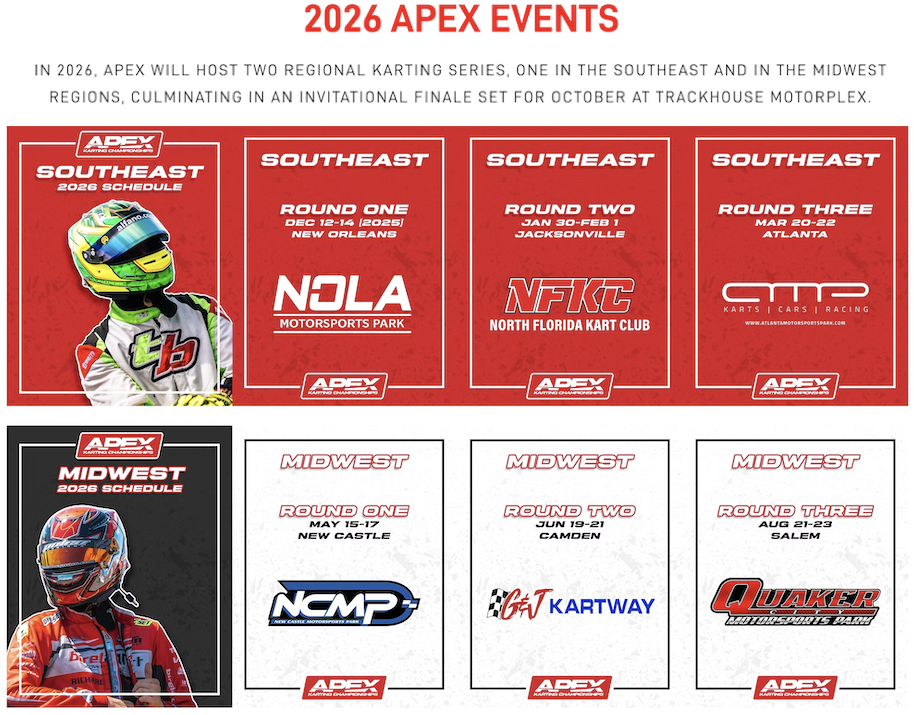 The Apex Karting Championship is a new, high-level regional racing program launching in 2026. Designed to bring professional-grade competition to the Southeast and Midwest, the series offers racers the chance to compete in premier events and earn an invitation to a centralized championship to crown the first-ever Apex Karting Champions.